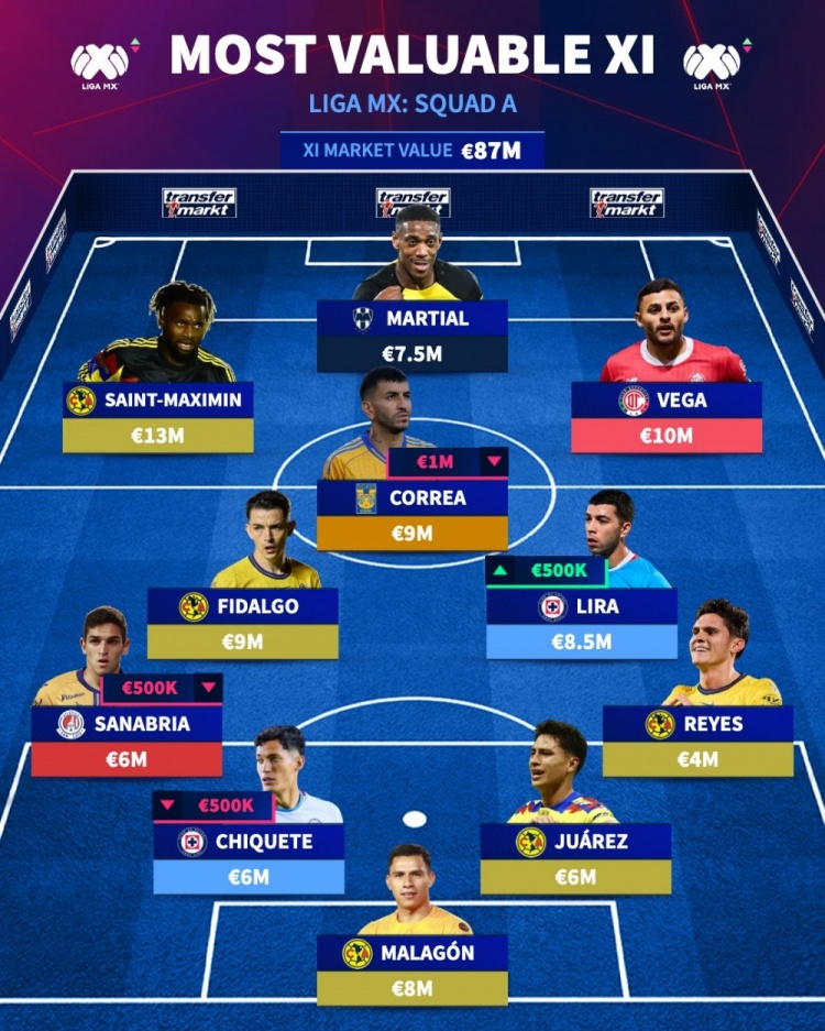 9月23日讯 德国转会市场统计了墨西哥超级职业联赛 球员的身价,并列出墨超身价最高阵形 。