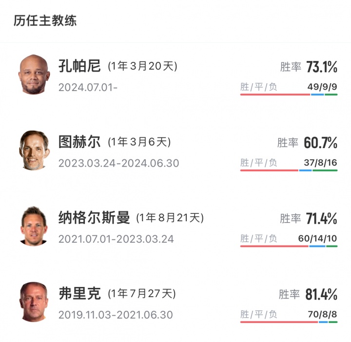 - 间隔8任主帅!孔帕尼是15年来首位续约的拜仁主帅,上次是范加尔