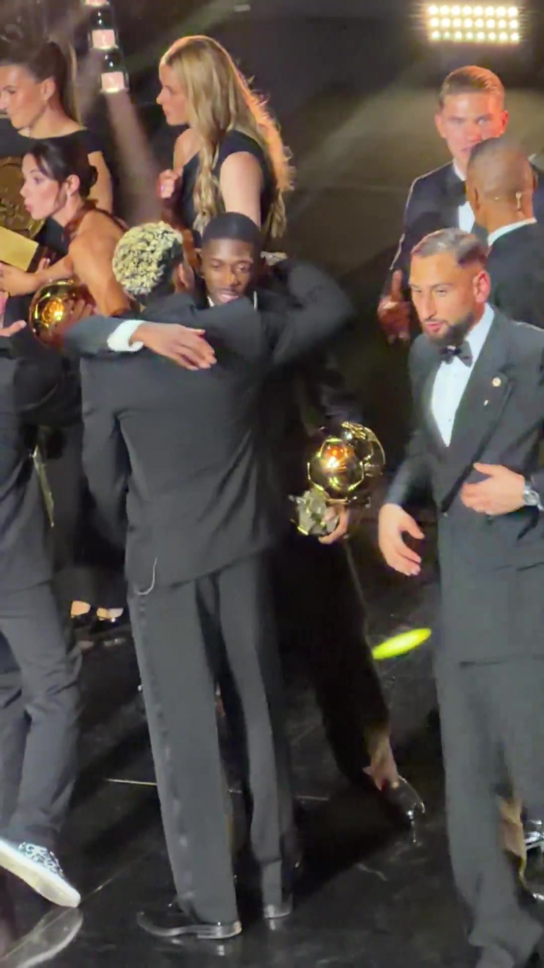 Respect🤝金球奖仪式结束后,亚马尔在旁等待并祝贺登贝莱获奖