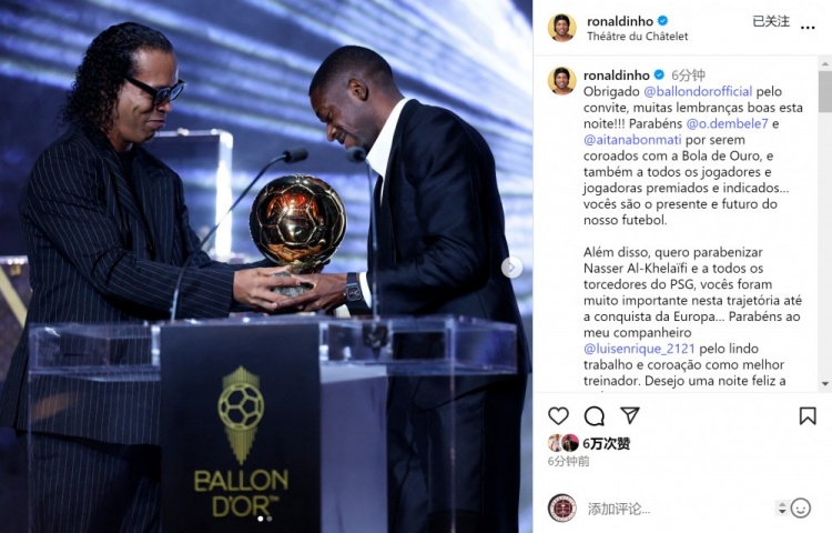 罗纳尔迪尼奥社媒晒出颁奖照片,并写道:“感谢金球奖的邀请,足球直播无插件免费在线观看今晚留下了许多美好的回忆!恭喜登贝莱和邦马蒂荣获金球奖,也祝贺所有获奖和入围的球员们……你们是古代足球 的现在和未来。”