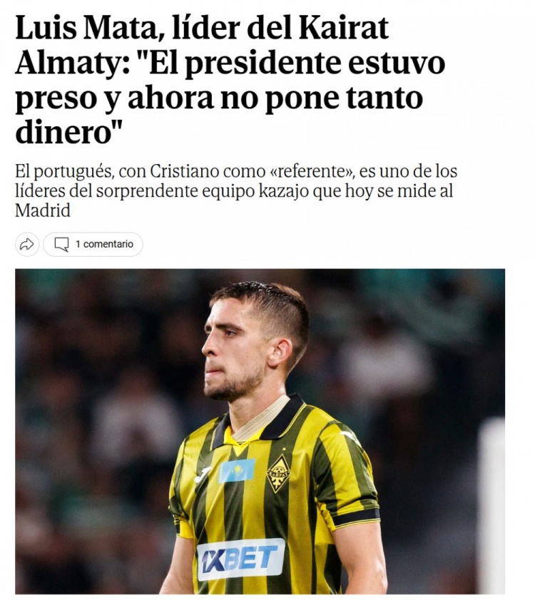 9月30日讯 欧冠第2轮,哈萨克斯坦球队阿拉木图凯拉特主场作战 迎战皇马。赛前,凯拉特的葡萄牙后场球员路易斯-马塔接受西媒《世界报》采访,谈到了球队的一些情况。