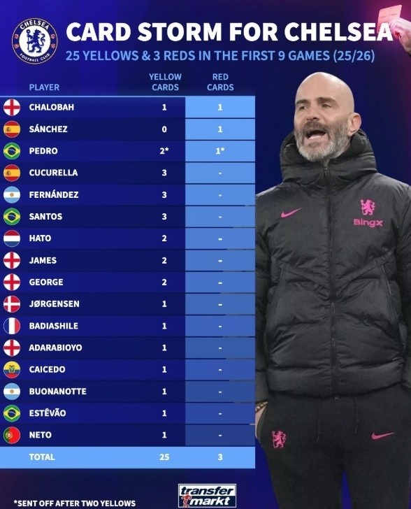 10月1日讯 德国转会市场统计,切尔西新赛季前9场赛事 ,领到25张警告 和3张驱逐 。