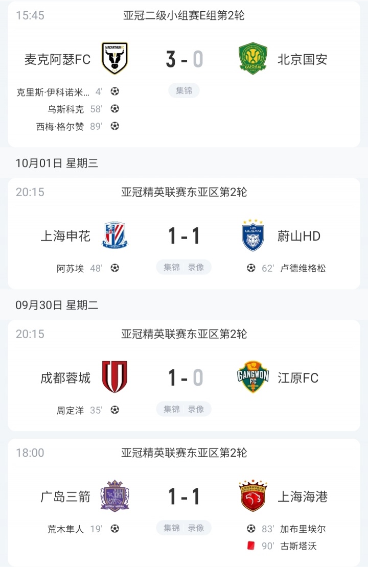 - 亚冠2积分榜:国安2轮仅1分掉至垫底,麦克阿瑟1胜1负升至第2