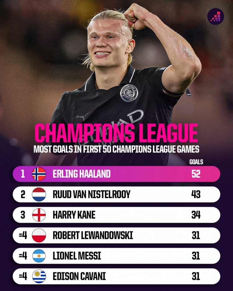 欧冠前50场得分 榜:哈兰德52球居首,范尼43球次席、凯恩34球第三