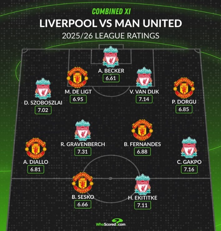 Whoscored列双红会本赛季评分最高阵:埃基蒂克领衔,B费在列
