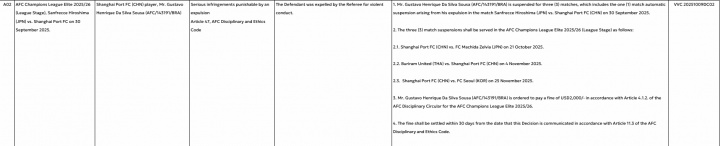 1-古斯塔沃因在对阵广岛三箭时被罚下,将被禁赛三场,其中包括一场自动停赛,这三场禁赛将在25-26赛季亚冠小组赛中执行。